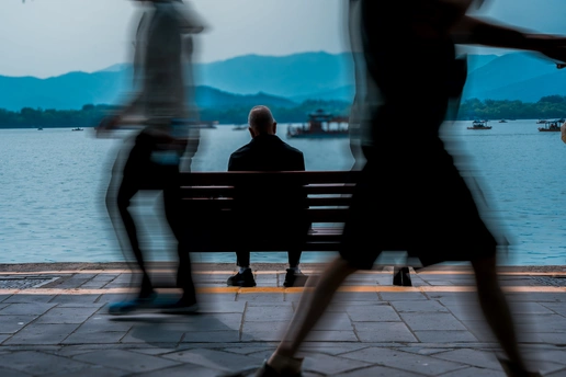 他独坐湖畔长椅,形单影只。湖水潺潺流淌,船只三两漂泊,远处山峦朦胧。周遭热闹似与他无关,孤独如影随形。他凝望远方,眼神深邃,过往回忆与眼前景致交织。这孤独是喧嚣世界里的宁静角落,是繁华落尽后的自我沉淀,他在这天地间,与孤独相拥,守着独属于自己的寂静时光。
