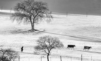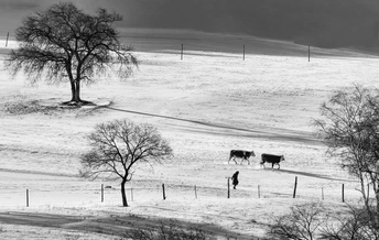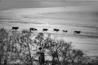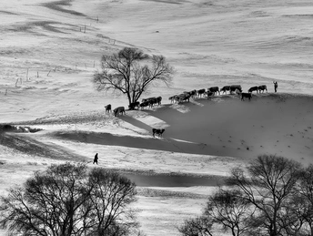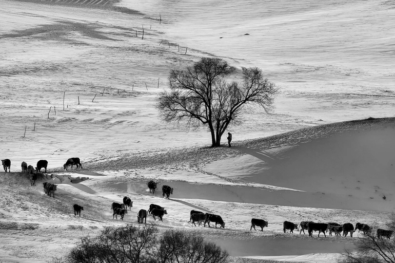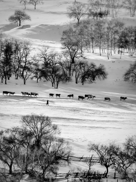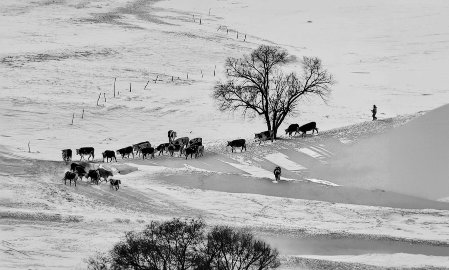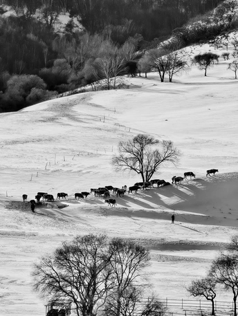 水墨染冬原,牛群踏雪行,每一帧都是刻在雪原上的流动画卷。 删繁就简的黑白影调,藏尽坝上冬牧的苍茫与诗意。牛蹄踏碎落雪,牧人身影渐远,天地间只剩纯粹的线条与光影,每一帧都是自然落笔的水墨长卷。