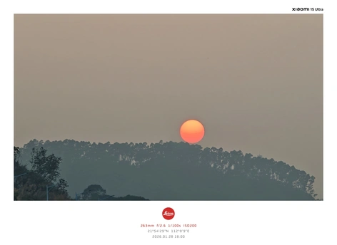 这张由 Xiaomi 15 Ultra(263mm 长焦镜头)捕捉的夕阳图景,定格了2026年1月28日18:00广东阳江(北纬21°54′29″、东经112°0′9″)的静谧黄昏。画面中,一轮橙红色落日悬于远处山丘顶端,炽热余晖与山丘上深绿色树木的剪影形成鲜明冷暖对比;天空因傍晚薄云略带灰度,却更衬出太阳的暖亮。 借助 f/2.6 光圈控制景深、1/100s 快门精准凝固落日动态、ISO200 低感保留纯净画质,263mm 长焦巧妙压缩空间,让太阳与山丘的上下构图如诗般简洁。橙红与深绿的撞色、远景山丘的朦胧轮廓,共同织就一幅“夕阳栖于山脊”的温暖画卷,尽显移动影像对自然光影的细腻捕捉力。