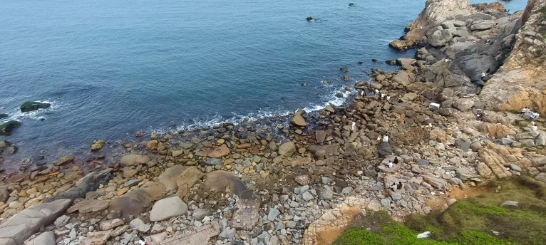 眼前的海面是层次渐变的蓝,从近岸处带着碎白浪花的浅蓝,一直铺展到远处与天色相融的深海蓝。风掠过海面时,细碎的波纹泛着柔光,几座孤零零的礁石在浪涛里若隐若现,像是大海藏起来的沉默标点。 没有汹涌的波涛,只有浪花一遍又一遍温柔地拍打着岩岸,发出细密的沙沙声。这声音裹着咸湿的海风,漫过每一块粗糙的礁石,也漫过岸边游人的衣角。
