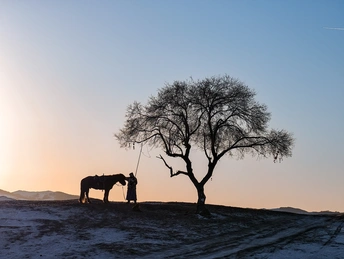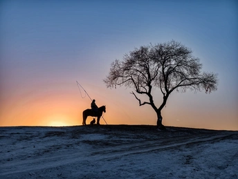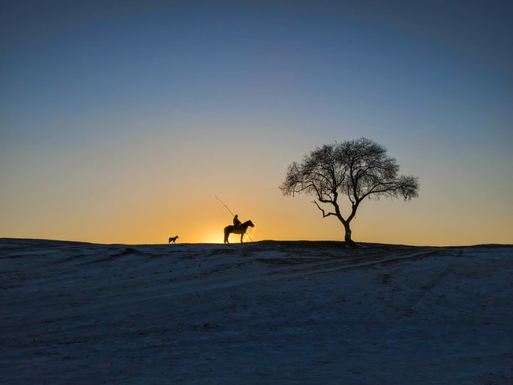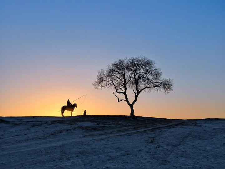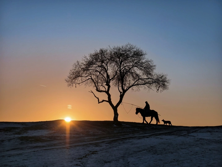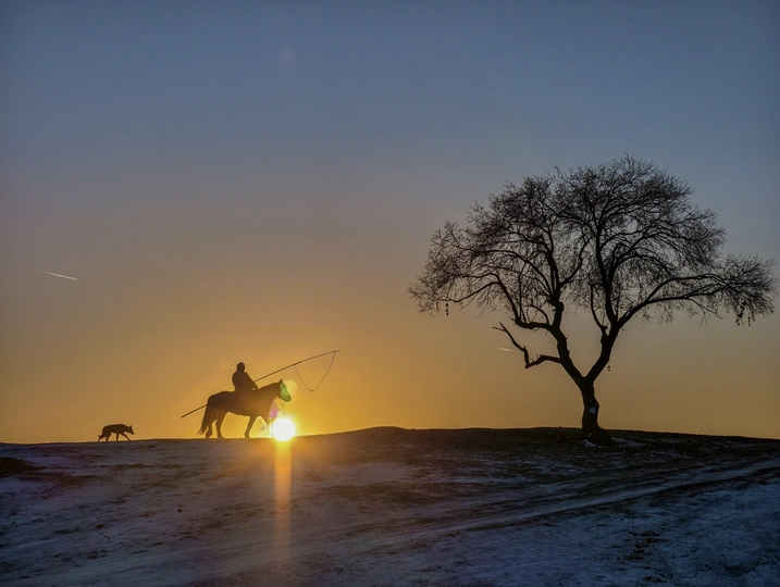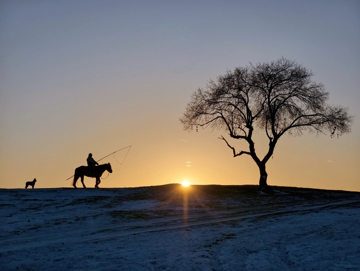 落日熔金,雪野凝霜 枯树为标,四影成诗 一人,一马,一犬,在暮色中铺展成画 逆光裁出的轮廓,是时光的笔触 犬吠与马蹄,是旷野的私语 霞光漫过雪原,万物化身为诗,镜头定格磅礴与浪漫 每帧剪影都藏着自然的抒情,每道光影都是马年的序章 以镜头敬雪野,敬陪伴,敬自由 愿新岁如骏马踏风,步步生光