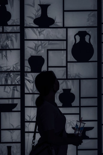 古意并非时间留下的记号,而是事物在时间里沉潜的姿态,是所有事物在光之下显露的真实躯壳。 她静立,凝视前方。竹影是虚的,陶器剪影是实的。光亮从背后漫来,将人与物都收进同一片静谧的灰度里。时间在此刻悬停——手持的现在,与灯箱上映出的遥远过去,在这方寸间,完成一次无声的对望。 这便是古意。