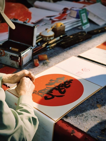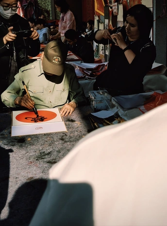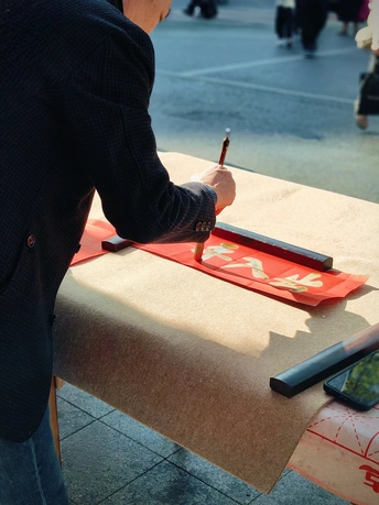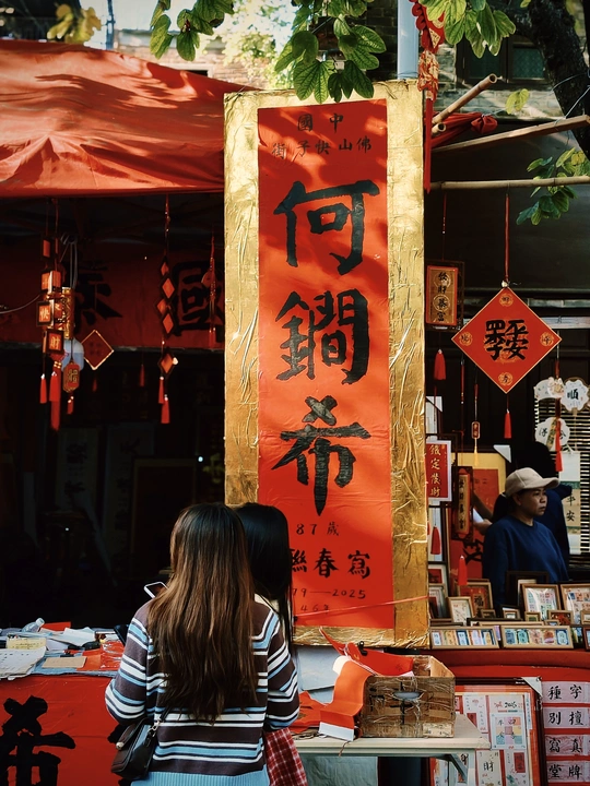 在佛山筷子路的街头,年味是具象的。斑驳黄墙下,红纸铺展如霞,老师傅们悬腕挥毫,阳光把红纸晒得暖烘烘的。墨汁在宣纸上洇出吉祥的纹路,顺着笔尖落进了家家户户的期盼里。