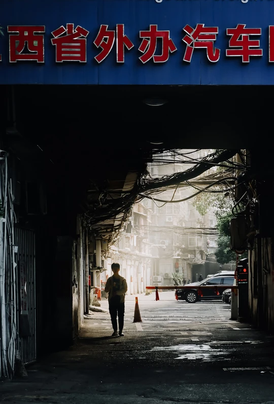 光从巷子尽头涌来,将前行者的影子投向身前。橙色路锥是唯一的亮色,像沉默的灯塔。两侧高墙夹出一条狭长通道,上方的电线网罗住一方天空。蓝色牌匾上的字迹半隐在阴影里。这是一个关于生活行走的瞬间,独自一人,走向光与影交织的新的一天,脚步声被巷子悄然吸收。