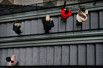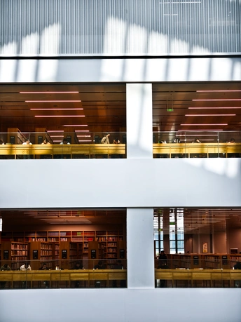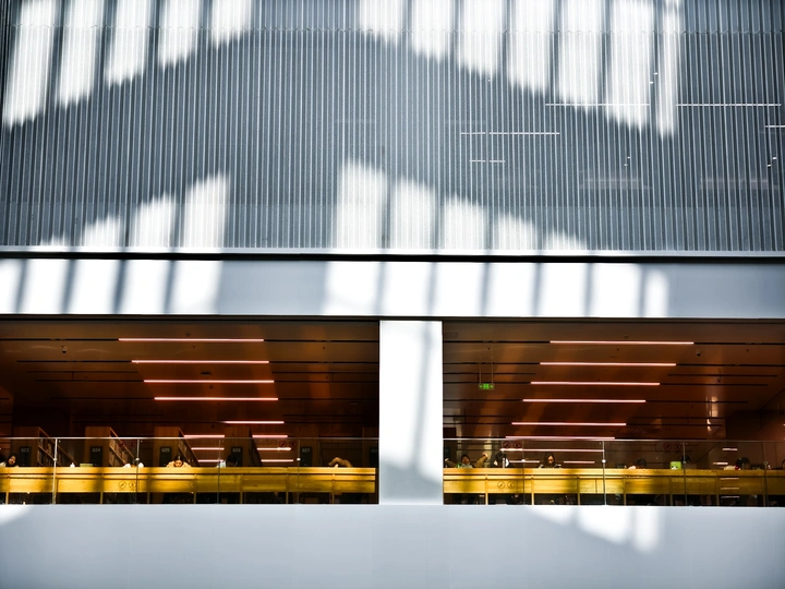 光被允许进入,透过巨大的玻璃,在木桌上摊开成明亮的方格。书脊的色谱从地面延伸到视线尽头,形成一道道静谧的峡谷。人在其中,成为移动的标点:或定格于桌前,或仰头搜寻于架前,或索性席地而坐,将自己嵌入知识的缝隙。 伸手的瞬间被捕捉——身体微微离地,指尖即将触碰到高处的某一行。这不只是拿取,更像一种向上的叩问。 安静并非无声,而是所有声响——翻页声、脚步声、轻轻的咳嗽——都被宽阔的空间吸收、安抚后,形成的厚重背景音。坐在下行扶梯阶梯上的红衣男孩,如同一个偶然的休止符,提示着这里的时间可以有不同的流速。 最终,镜头转向室外。飘扬的旗帜与通透的建筑立面,将这座知识的容器锚定在广阔的天空与城市之间。它始终敞开着,接纳所有寻求专注的个体,进行一场无需言说的、关于精神秩序的集体自习。