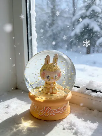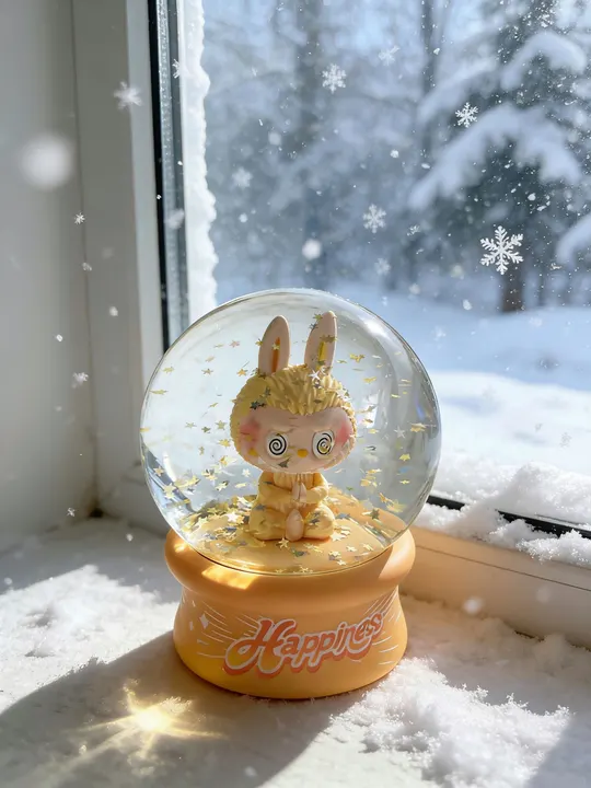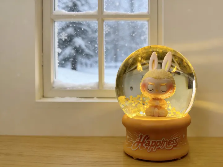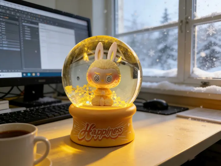 办公室的窗沿落了细碎的雪,暖黄的台灯下,水晶球里的拉布布蜷成一团,星屑在透明球体里轻轻摇晃。 窗外是冬的清冷,窗内是小世界的温柔。不必追赶忙碌的节奏,就着这一团暖光,让飘雪与星光在这一刻,都成了工位上的小确幸。