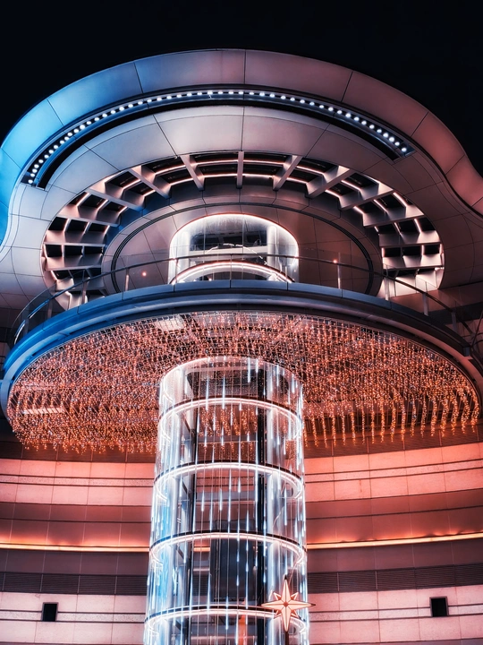 夜色下,城市建筑在蓝橙光色里如外星飞碟一般,流光溢彩的电梯就像通往宇宙的太空电梯,科幻感、未来感、梦幻感扑面而来,仿佛我们正身处一个遥不可及的世界之中。