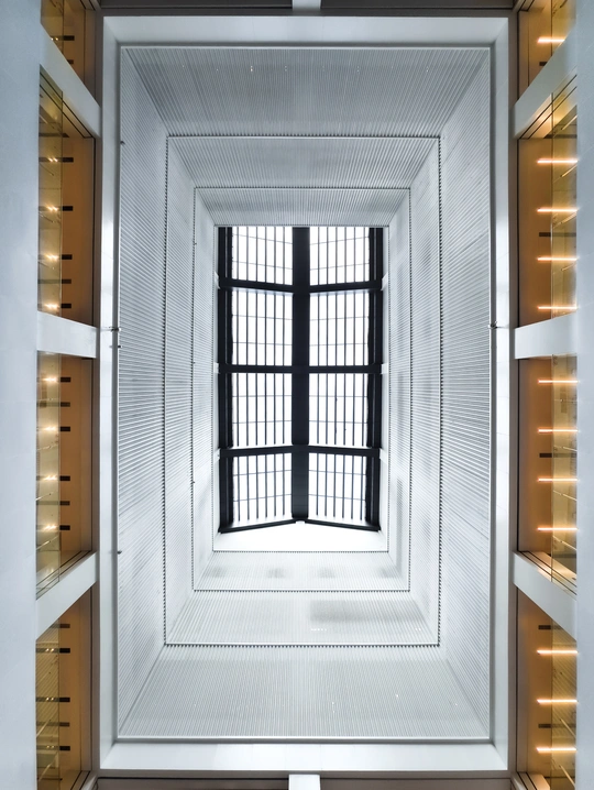 仰首望去,纯白的建筑内部化为一道深邃的峡谷。两侧是带有垂直线条的陡峭幕墙,向着顶部的光口无限延伸。阳光穿过天窗的金属网格倾泻而下,在层层平台边缘勾勒出分明的光影。黑白色调强化了这几何构成的纯粹与力量感。