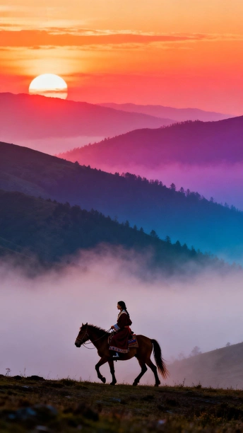 晨雾漫过草原,霞光染透山峦。 一袭红装,一骑绝尘,在天地间写下自由的诗行。