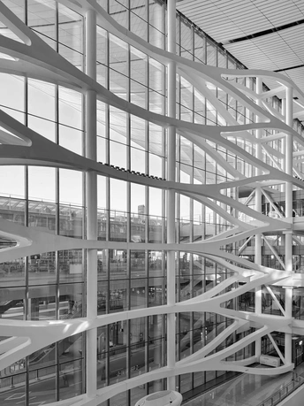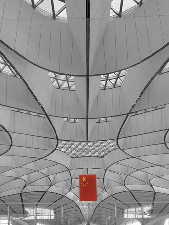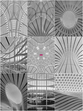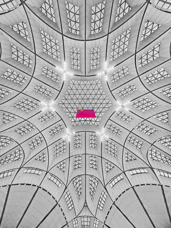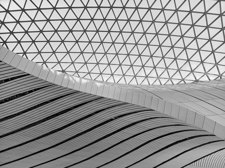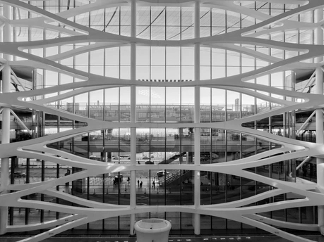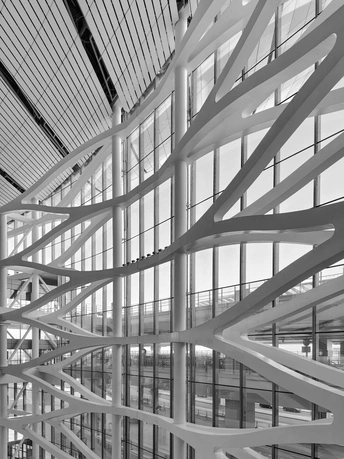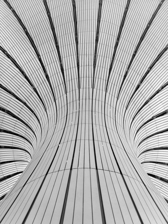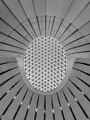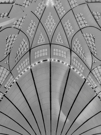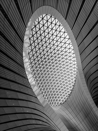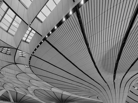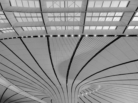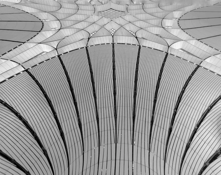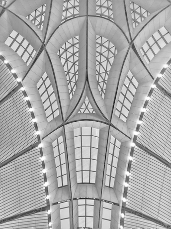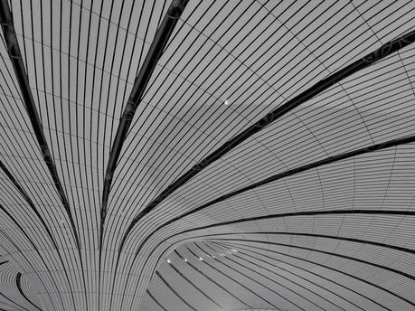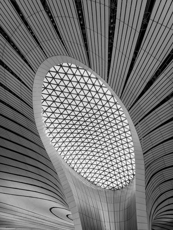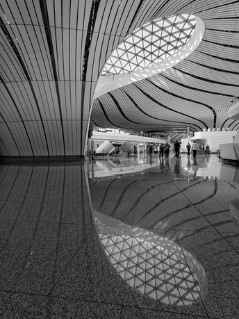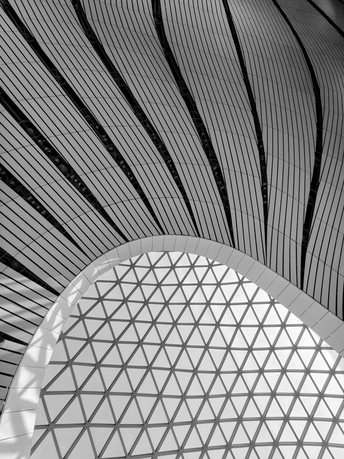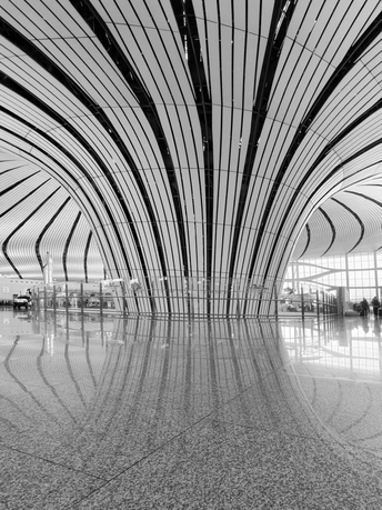 黑白影像剥离了大兴机场斑斓的表皮,直抵建筑的“凤骨”。镜头捕捉了凤凰穹顶的放射状线条、C形柱的流畅曲线,以及菱形网格的几何秩序,在明暗之间勾勒出建筑的原始力量。暖橙的灯带隐去了色彩,只留下纯粹的光影层次,让凤凰展翅的设计意象,在极简的黑白灰中更具张力。 每一个对称的构图、每一道延展的弧线,都在诉说着国门建筑的理性与浪漫。当色彩褪去,剩下的不仅是结构之美,更是镜头与建筑灵魂的对话,一场凝固在底片上的、属于当代中国的建筑史诗。