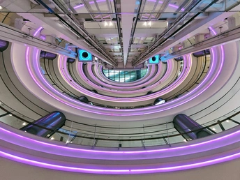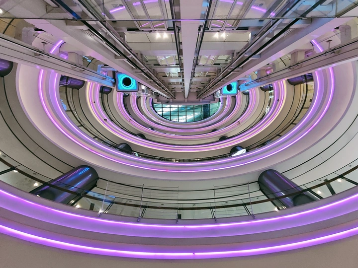 紫光灯带缠绕着旋转的楼层,观光梯像悬浮的眼睛,把都市的喧嚣都滤成了流动的霓虹。