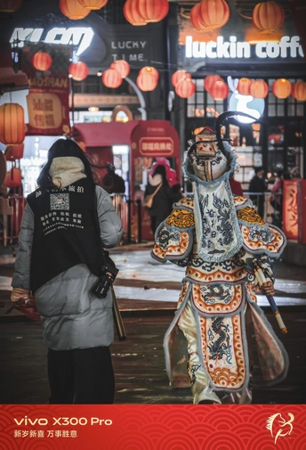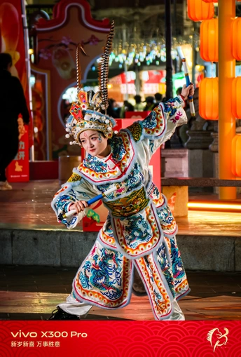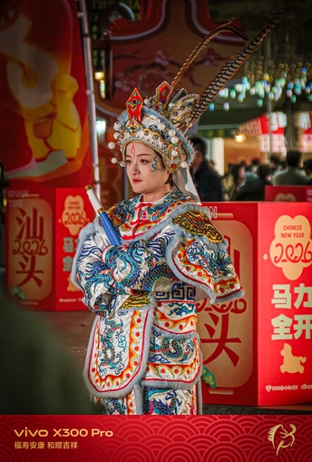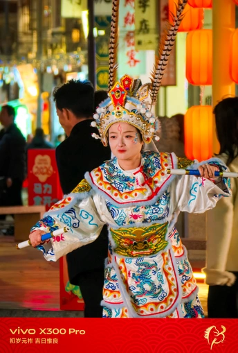 这组照片拍摄于广东汕头的新春街头,定格了英歌舞表演者在夜色与红灯笼间穿梭的瞬间。英歌作为潮汕地区极具代表性的非遗民俗,其刚劲的舞步与华丽的戏服,在现代商业街区的背景下,碰撞出传统与当代交织的独特张力。 画面中,表演者身着绣满龙纹的戏服,头戴缀有雉鸡翎的盔帽,手持双槌,在人群中穿行。她的妆容带着一抹朱红与蓝纹,眼神坚定,仿佛从历史深处走来,又融入当下的热闹。背景里,瑞幸咖啡的招牌与“汕頭”的红色立牌相映,现代商业符号与非遗文化在此刻共生,构成了一幅鲜活的当代民俗图景。 夜色里,红灯笼的暖光与街灯的冷调交织,vivo X300 Pro精准捕捉到戏服上的金线刺绣与表演者的动态瞬间,让传统英歌的力量感在现代都市的烟火气中得以延续。这不仅是一场表演,更是潮汕人对年俗的坚守,是传统文化在当代生活中的鲜活表达。