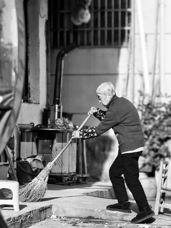 霜鬓轻挥竹帚长, 阶前细扫岁痕香。 柴门静对晨光里, 一帚尘消岁月长。