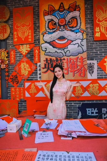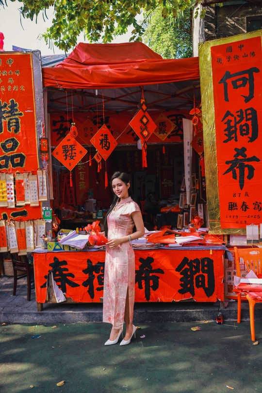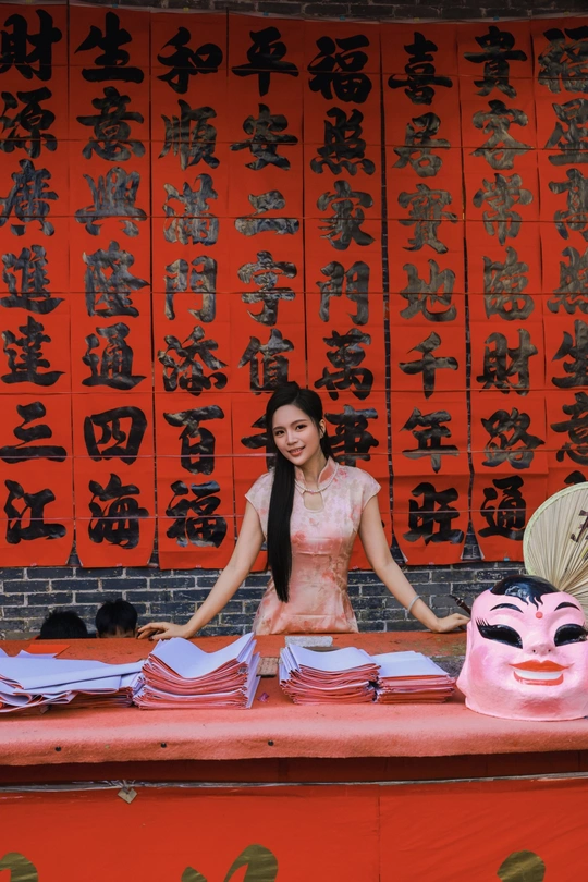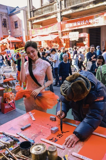 佛山的年味,浸润在老街的墨香里。 红笺漫铺,笔走龙蛇,这方手写挥春街,是城市里最后的旧俗温床。 着一袭旗袍穿行其间,仿佛踏入时光的景深。 老师傅俯首运笔,风过处,皆是吉祥。 我恰好路过,以镜头为框,定格下这抹最动人的人间中国红。