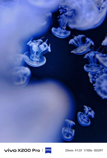 深蓝如幕,水母是坠落的星子。 半透明的伞翼载着细碎的光,在幽暗中舒展、漂浮,像一场无声的梦境。它们不急不缓,用柔软的姿态,把深海的孤独,酿成了温柔的诗。 每一次翕动,都像是在对世界说:别急,慢慢来。
