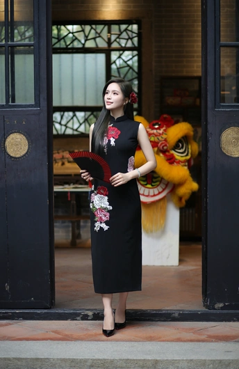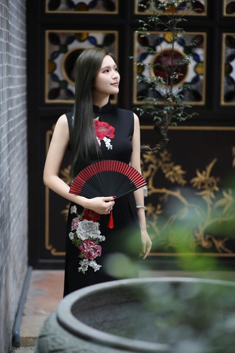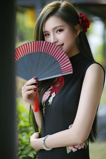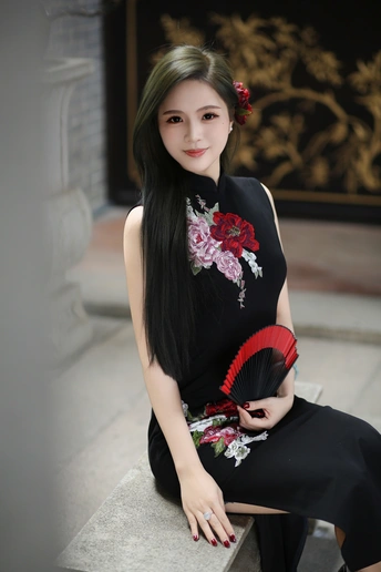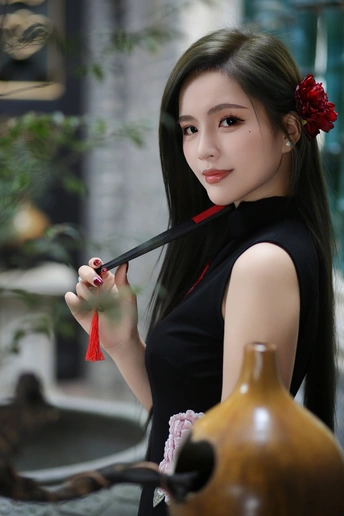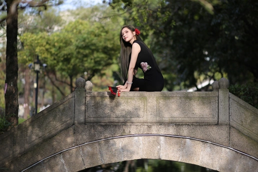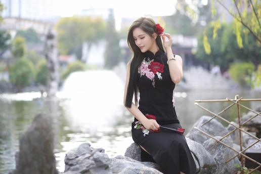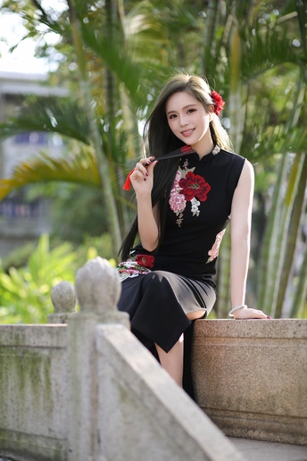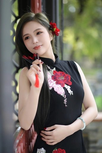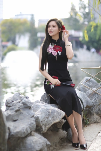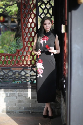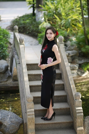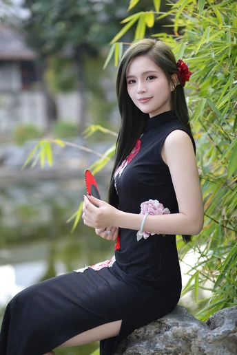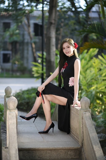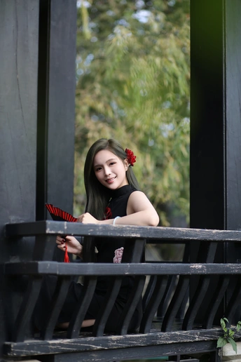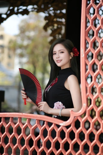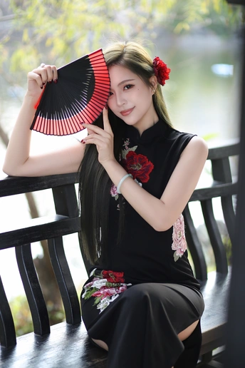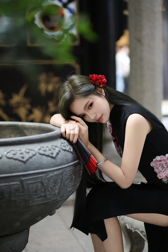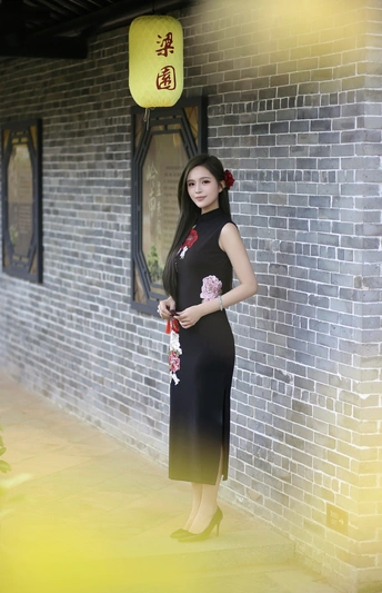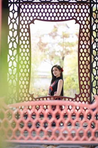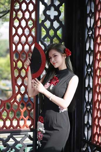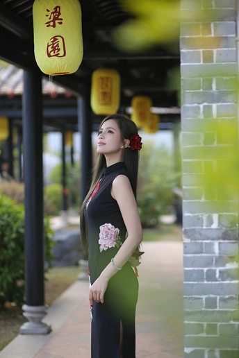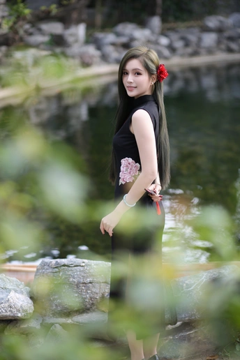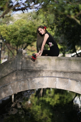 青石板桥,流水潺潺,一袭旗袍,风过林梢,吹动发间的红,也吹皱了一园春色,不必追赶时光,此刻便是最好的江南。