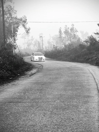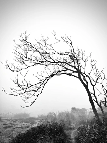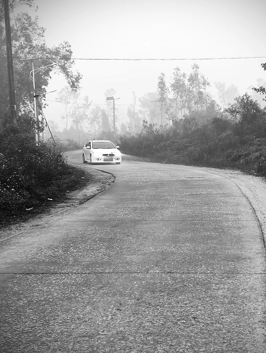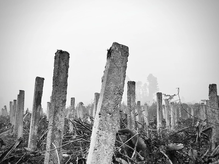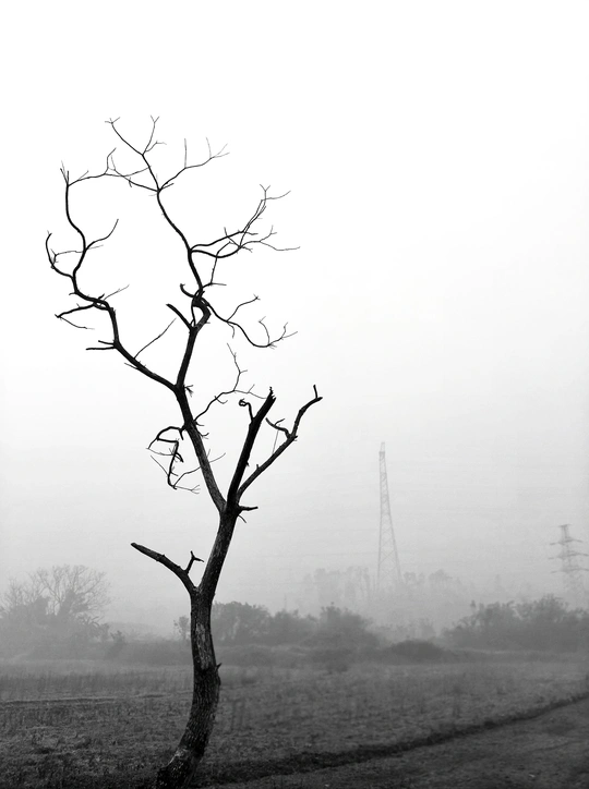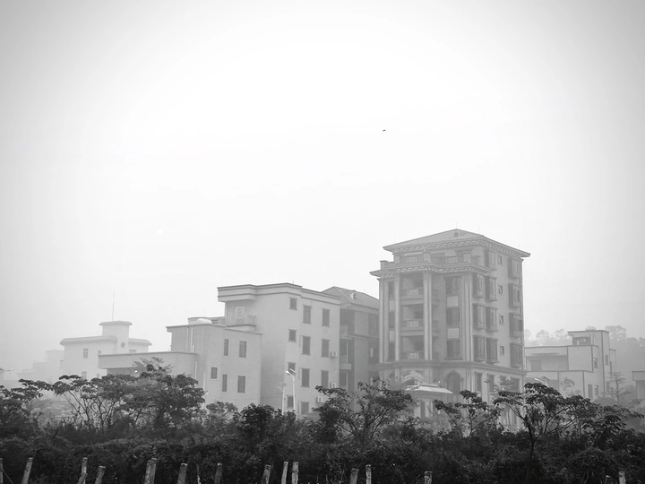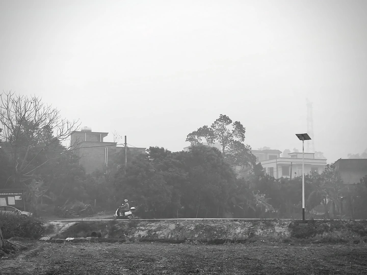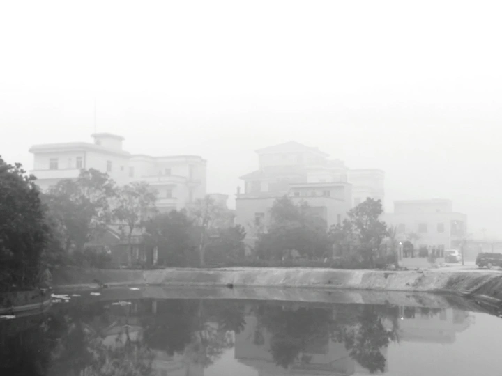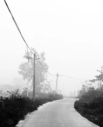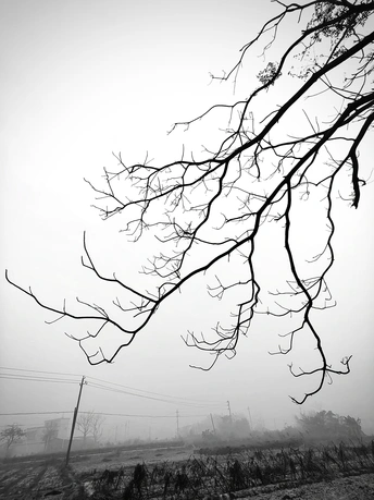 雾锁山村,万物留白。 枯树的枝桠在雾里写着诗,水泥路在雾里蜿蜒成谜。 那些被时光遗忘的桩柱,那些在晨雾中独行的身影,都成了这黑白世界里,最生动的注脚。