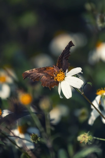 构图以“微距叙事”构建焦点张力:主体蝴蝶与白花占据画面中心,蝴蝶翅膀的残缺边缘与花瓣的完整形态形成对比,触角与花蕊的缠绕构成视觉锚点。背景采用浅景深虚化,模糊的黄绿叶片与散落的白色小花形成渐变层次,既突出主体的细节纹理,又营造“一花一世界”的幽微意境。蝴蝶翅膀的斜线姿态打破平衡,让静态画面生出欲飞未飞的动态感,观者目光不自觉被引向翅尖的破损处——那里藏着故事的密码。 色彩是自然的隐喻性对话:蝴蝶翅膀的赭石棕与枯叶黄,如同被时光浸染的旧纸,翅尖的残缺处泛着焦褐色,暗示生命的磨砺;白色花瓣如凝脂,黄色花蕊似碎金,鲜活的色彩与蝴蝶的沧桑形成冷暖碰撞。背景的墨绿与浅绿渐变,为画面注入沉静的生命力,色彩在“残破”与“鲜活”的对比中,完成对“美”的重新定义——残缺从未减损生命的光彩。 情感藏在“脆弱与坚韧的共生”里:蝴蝶残破的翅膀让人怜惜,而它专注吸食花蜜的姿态又透着倔强。花瓣的柔嫩与翅脉的刚毅,在微距镜头下化为具象的情感符号:那不是凋零的哀愁,而是历经风雨后的从容;不是生命的妥协,而是与自然温柔相拥的智慧。观者在细微处感受到震撼——原来残缺也是一种圆满,脆弱里藏着最动人的生命力。