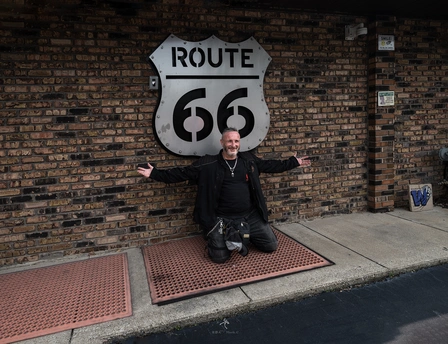 美国66号公路上偶遇来自意大利的摩托车车队的领队。完成了他的骑行66号公路的心愿。帮他留个影。