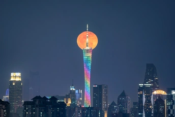 万厦凝眸,珠水息澜,独见小蛮腰凌空撑起橙红满月。羊城灯火朝拜,明月为其加冕。