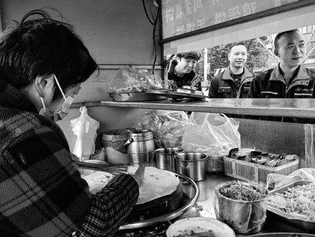 上班族在街头小吃摊上点餐后,不约而同的被诱惑了,而老板娘还是专注自己的生意,不同的眼神,鲜明的对比。不同的诱惑,不同的感受。