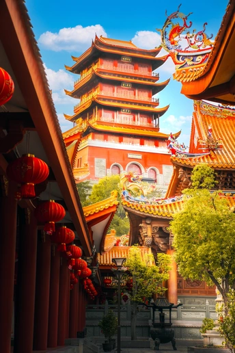 朱廊衔翠,丹阁凌霄。 这帧影像以闽南古建的经典视角,凝萃了厦门梵天禅寺魁星阁的东方美学意韵。层叠飞檐如翼展云天,橙金瓦顶在澄澈碧空下熠熠生辉,檐角的龙纹雕塑与繁复斗拱,承载着千年匠造的精工之美。作为八闽最古老的梵刹之一,梵天禅寺的魁星阁不仅是登高揽胜的地标,更是闽南文化与佛教禅意交融的精神坐标。朱红廊柱间,红灯成串,光影流转间,既有古刹的庄严静穆,亦藏着闽南建筑鲜活的色彩肌理。一阁承千年,一境藏万象,这是东方美学在当代的诗意回响。