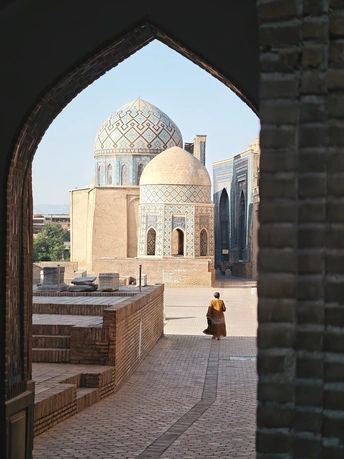 穿过撒马尔罕的尖拱门洞,夏伊辛达的穹顶在日光下泛着千年的蓝。 土黄长裙拂过石板路,每一步都踏在古丝绸之路上的文明褶皱里。 这里是“永生之王”的安息地,也是我与中亚的温柔对视。