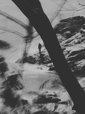 这是一次在海岸线的时间实验。我用多重曝光,将礁石上的人影与海浪的流动线条叠合,让凝固的瞬间与流逝的潮汐在同一张底片上对话。黑白影调剥离了色彩的干扰,让画面回归本质:人是海岸的观察者,也是时间褶皱里的一道影子。 当镜头对准海,我捕捉的不仅是浪,更是风的轨迹、记忆的余温,以及我们与自然之间那层若即若离的灵韵。
