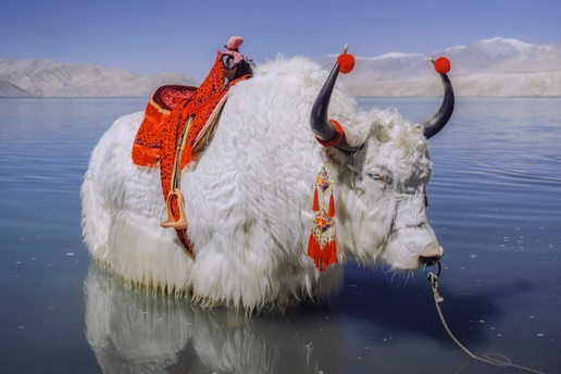 在帕米尔高原的湖畔,一头身披华丽鞍具的白牦牛静立水中,等着下一个拍照的游客。