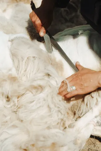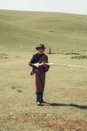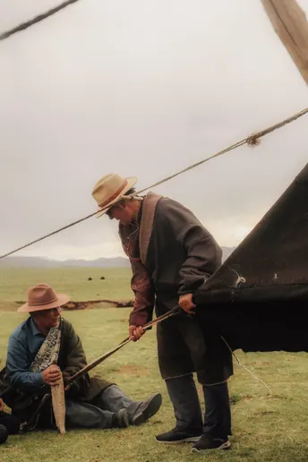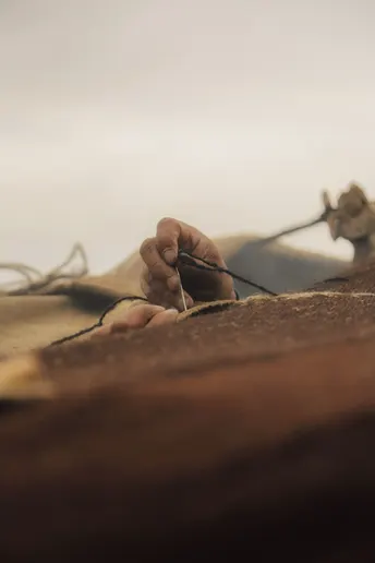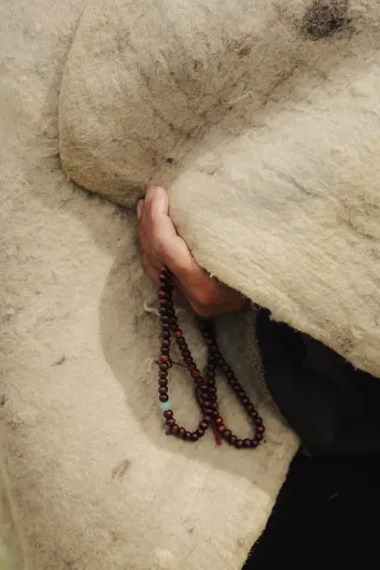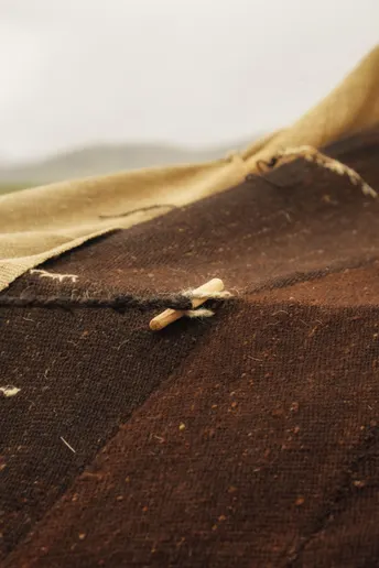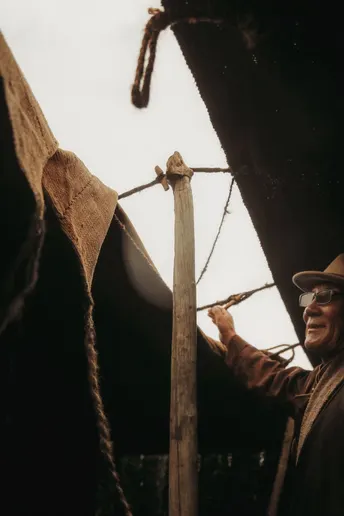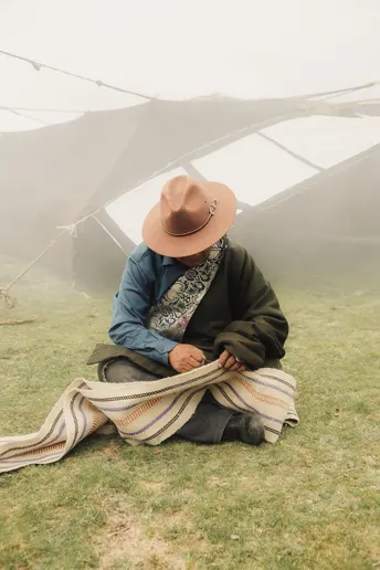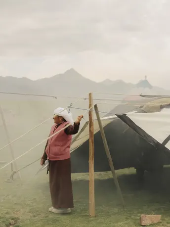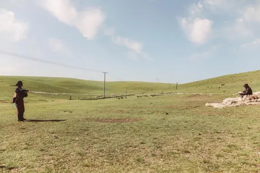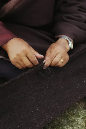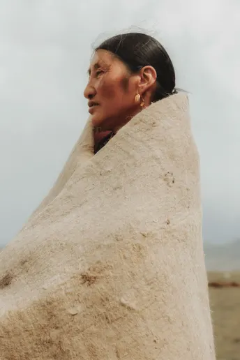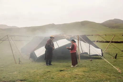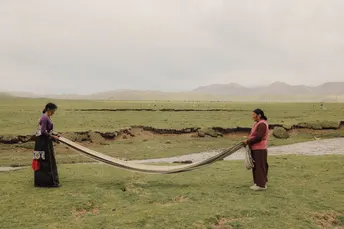 不同于南方的绫罗绸缎,轻盈如语,藏地的布,厚重如地,抵寒、抗磨,经得起风雪与岁月。一个缠绕身体,一个遮护生活。 牧民不言,技艺留在手上,语言藏在布里。谁也没有说过「传承」两个字,但一针一线,已经是回答。人走、牛羊走,线也跟着走。线的背后,是图案,是秩序,是没有被书写的历史。 北上青海,我们不是在看织布,是在看生活如何慢慢被织出来。 青海湖畔,草木初绿。到达的这片牧区,正值转场前夕。剪羊毛,是这个季节的头等大事。各家各户都在忙着分拣、打包、翻新帐篷。等一切就绪,便带着牛羊出发前往夏牧场。游牧,是一种不断告别的生活方式,牧民逐草而居,随着季节变化转场,一年中至少要经历几次大规模迁移,在夏牧场和冬牧场之间往返。基于这样的生活需求,牧民所用到的「布」以实用、耐磨、年限长为基础,一部分还会辅以相应的工艺图案表达吉祥美好的期许。 牧人朋友们也说,现在这类传统的手艺,也再一点点被现代化的方式替代,那些温暖的布艺,也许也会在某个时间节点消散。