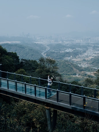 山风漫过栈道,把远处的城揉成一片淡墨。 玻璃映着树影,也映着我伸手去碰的风。 不必看清每一栋楼,雾里的轮廓,才是春天最温柔的模样 📷:富士GFX100RF