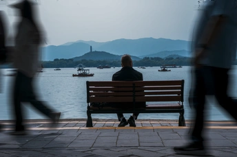 世间熙攘,皆为过客。 一人一椅,一湖一山, 于喧嚣中守一份独处的宁静。