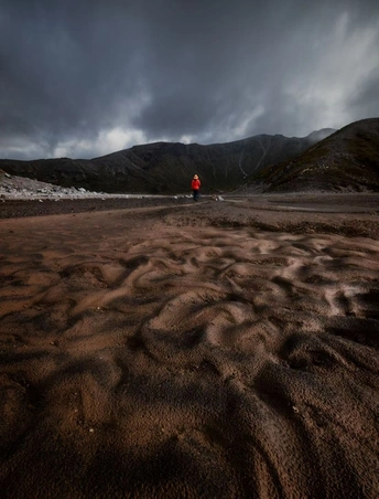 拍摄于十二月的汤加里罗国家公园。风暴云层低压在火山谷地之上,砂砾地表被风与水反复刻写,起伏成一片缓慢流动的纹理。我行走其间,从这片古老而沉默的火山之心缓缓经过。 #新西兰 #汤加里罗国家公园#火山谷地#火山荒原 #荒野行走 #人物与风景 #风暴云层 #徒步旅行#风光摄影#NewZealand #TongariroNationalPark #