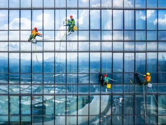 炎炎夏日下,深圳CFC长富大厦外,工人们悬挂在300米高空清洗玻璃幕墙,用汗水勾勒深圳和香港两座城市的别样风景线。 ? Shot On DJI Air 2S