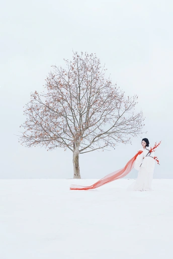 红梅映雪佳人立,黛鬟簪玉浅笑柔。 素衣胜雪立寒阶,疑是瑶台降凡间。