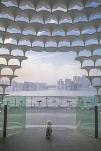 无锡江尖公园的地标艺术建筑大陶缸,一只小狗在里面看到面前突然喷出的喷泉看的很入迷。