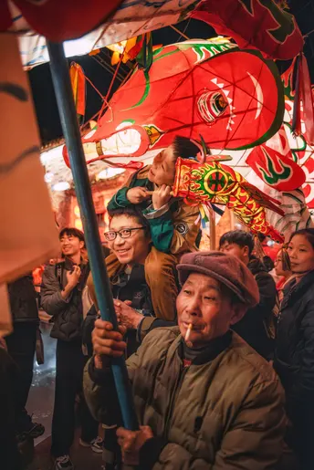 拍摄于安徽省徽州古城附近的瞻淇村,人群举着鱼灯在小巷中穿梭格外热闹,我挤入人群拍到了骑在父亲头上手抓鱼灯憨态可掬的稚童、喜逐颜开的父亲、满面春风的老人、在热闹氛围下喜眉笑眼的路人小哥以及一家人一起舞鱼灯的温馨瞬间。