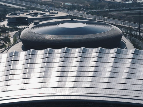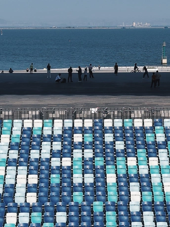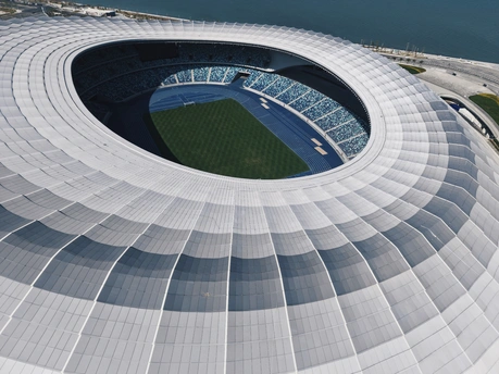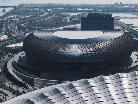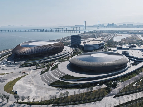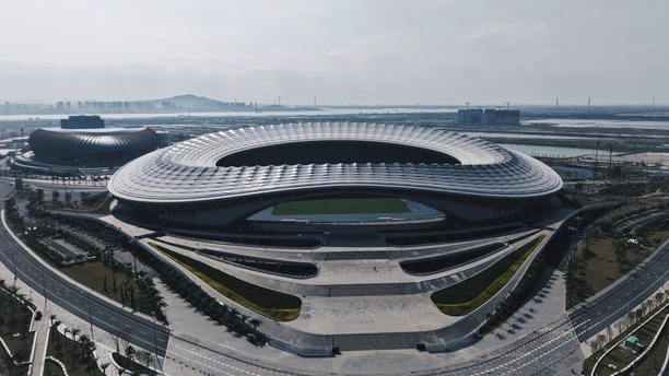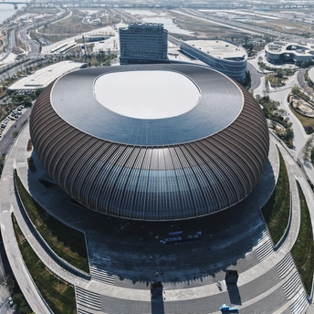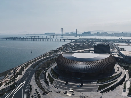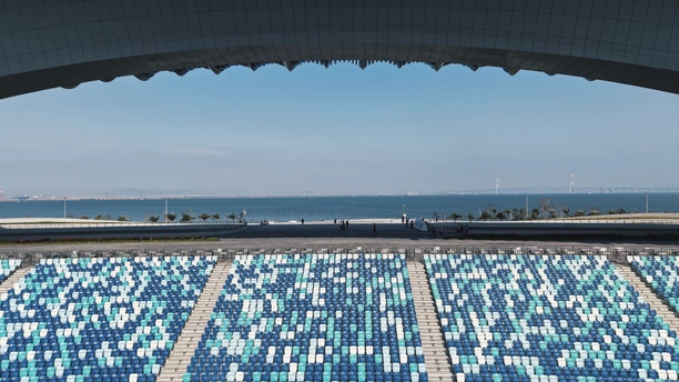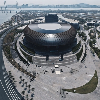 从伶仃洋到南沙岸, 这座圆形场馆静静伫立。 曲面屋顶映着天光, 蓝绿座椅藏着未来的呐喊, 它是湾区文体的新注脚。