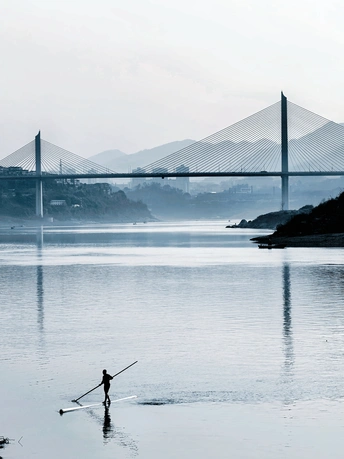 谁懂啊!在重庆长江边亲眼看到了“一苇渡江”的独竹漂✨ 一根竹子就是船,一根长篙就是桨,匠人站在上面稳稳前行,背后是现代斜拉桥,整个画面像从古诗里走出来的一样,水墨感拉满。 这就是藏在重庆江景里的非遗浪漫,太值得来打卡了!