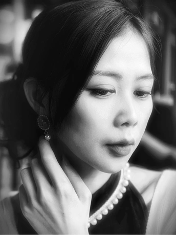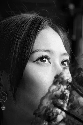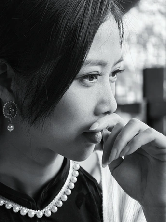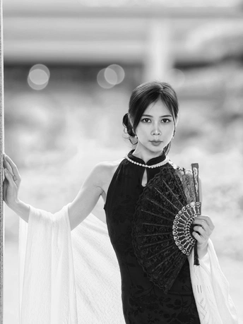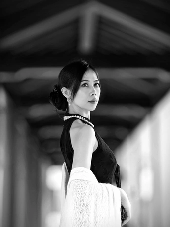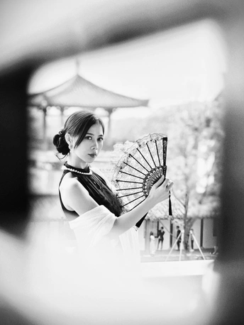 黑白影调剥离了色彩的繁杂,恰好中和了阴天的柔和光线。古建筑的飞檐与廊柱在灰调背景下更显沉稳,一袭黑裙执扇而立,蕾丝折扇的纹理、珍珠项链的光泽,都在黑白画面中变得极具质感。 没有强烈光影的干扰,眉眼间的古韵、指尖轻触扇面的细腻动作,都被镜头精准捕捉。黑白影韵下的东方美,多了一份内敛与深沉,也让这次阴天拍摄有了别样的韵味。