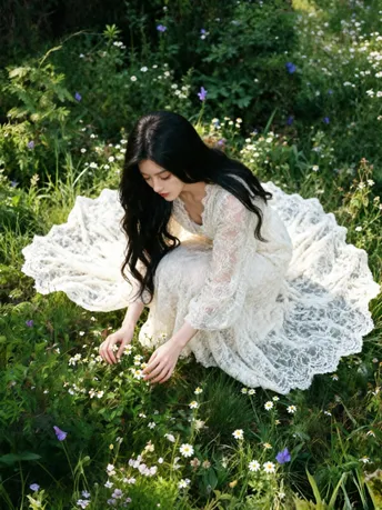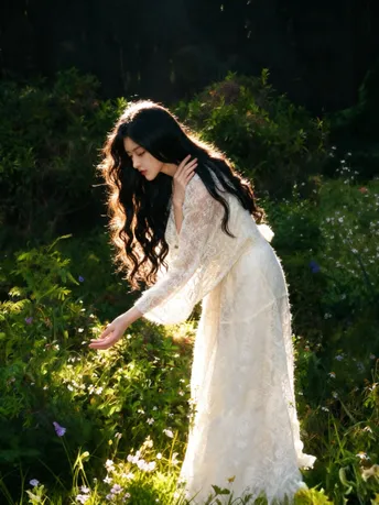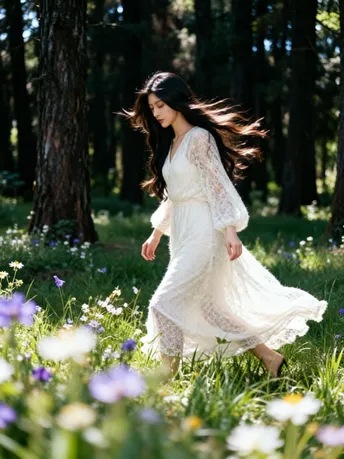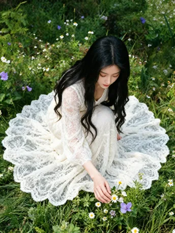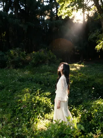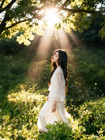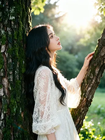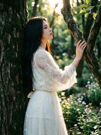 光把午后揉成碎金 落在你微仰的侧脸 苔藓在树皮上呼吸 替时光,轻轻吻过你的肩 长发漫过蕾丝的温柔 像风漫过林间的雾 指尖触到年轮的纹路 每一道,都是大地写给你的情书 不必追问风的去向 不必追赶光的脚步 你靠在树的怀里 听它说—— 安静,也是一种奔赴