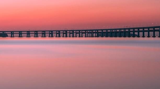 长曝光抚平海面,橘红晨光吻过星海湾大桥。 一线桥影横卧暖调海面,大连的日出,静得刚刚好。