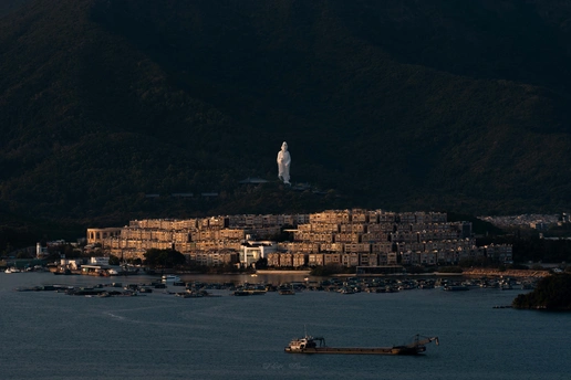 照片拍摄于香港中文大学的黄昏时段,巨大的菩萨雕塑被夕阳照亮,仿佛在守护着脚下的人间。