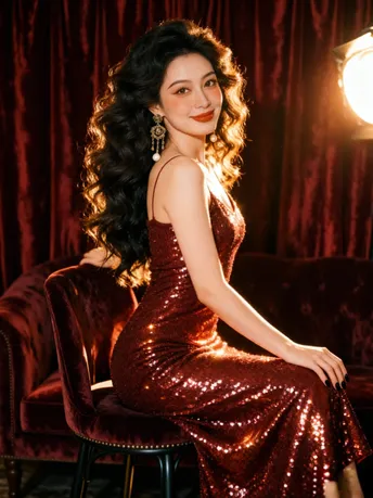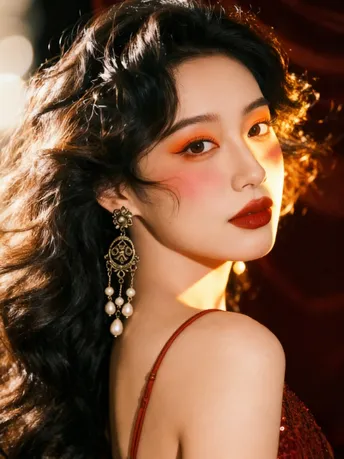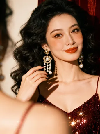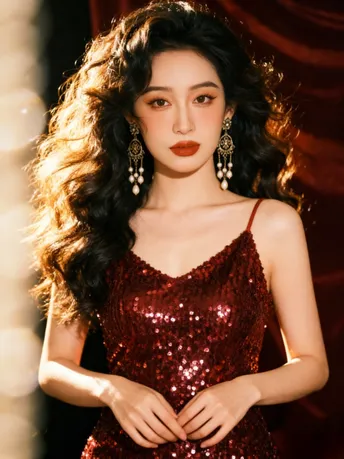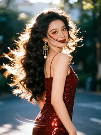 红裙是流动的星子 亮片踩着步点 在背骨的弧度上 抖落一整片暮色的碎钻 耳环是旧时光的低语 雕花托着珍珠的白 垂成一串未说尽的温柔 在耳尖轻轻摇晃 阳光吻过卷曲的发 每一缕都裹着慵懒 风掀起裙角时 浪漫便从发梢漫到脚踝 把某个回眸 酿成永不褪色的帧