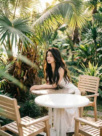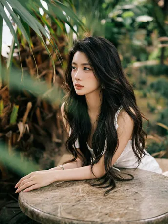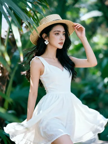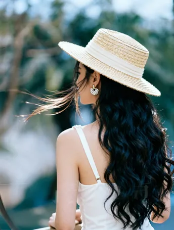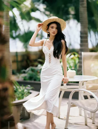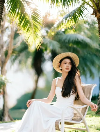 草帽轻扣住风的碎影 光斑在裙褶间缓缓流淌 白裙扬起的弧度 是夏日最柔软的私语 椰林把风揉成温柔的诗行 拂过发梢,也拂过慵懒时光 藤椅蜷着半梦半醒的光阴 蝉鸣被碎花耳环轻轻别住 不再喧嚣 青石板路浸着微凉 心事随着裙摆漫延 一步,一漾 把整个盛夏的温柔 都藏进这片刻的安详
