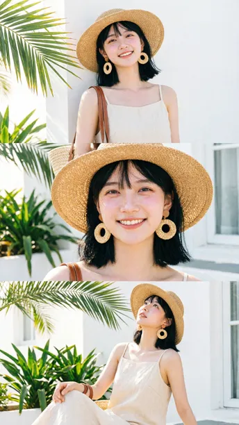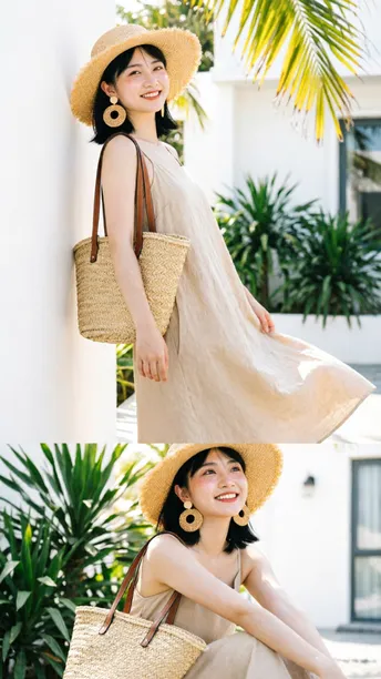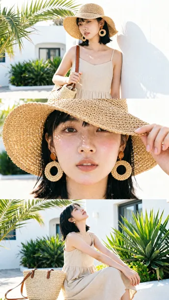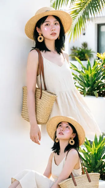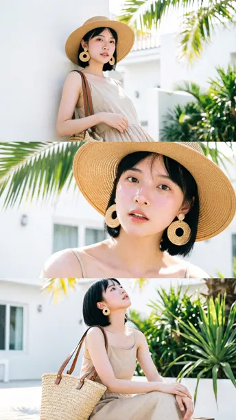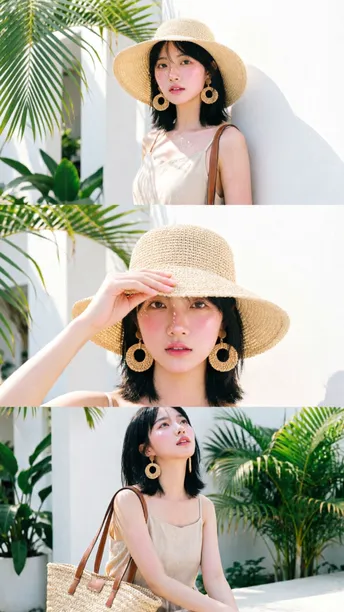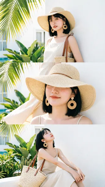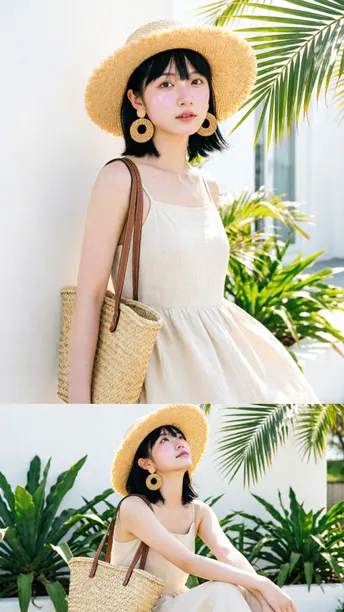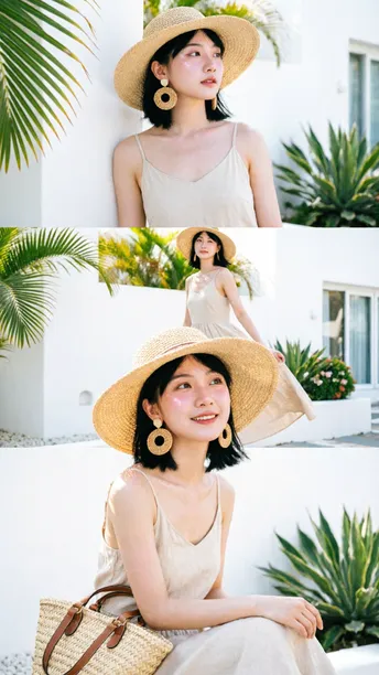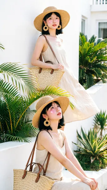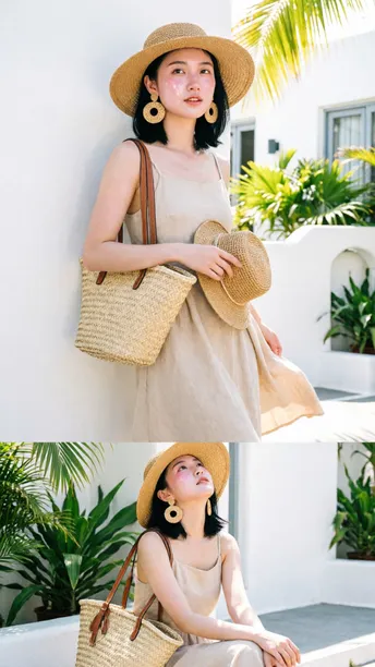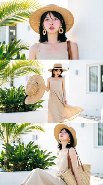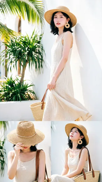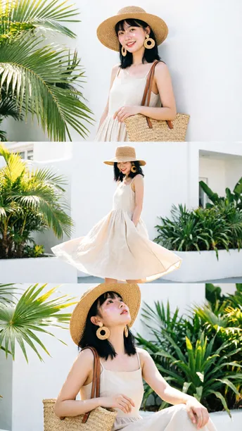 草帽与棉麻裙 在棕榈的碎影里 铺展开一整段夏日叙事 圆形耳环垂在耳畔 精准落进画面的黄金分割 不动声色,便定格了视觉的平仄 风漫过来,扬起裙摆 划出柔和的弧度 那是时光 最温柔的几何表达 不必刻意言说美好 衣袂轻扬,光影错落 夏天的诗,早已写在风里