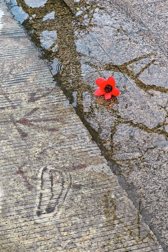 你瞧那朵红棉花,在灰石板上跳着红色的心跳。雨珠还挂在花瓣上,水洼里的影子也跟着红。路过的脚都绕着走——原来最微小的生长,也能让街头变得温柔。