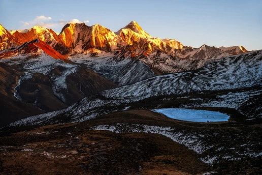 这张照片拍摄于川西康定木雅措,是贡嘎雪山的经典日照金山时刻。傍晚的第一缕阳光,将连绵的贡嘎群峰镀上一层炽热的金红,雪峰在光影中如被天神点燃,冰棱与岩石的纹理在暖光下清晰可见,尽显雪域王者的雄浑与庄严。 前景中,冰封的木雅措如一块幽蓝的宝石静卧在草甸之上,与远处的金山形成冷暖对比,几位徒步者的身影点缀其间,更衬出自然的壮阔与人类的渺小。整幅画面以蓝、金、褐三色交织,既展现了高原的凛冽清冽,又传递出日照金山的温暖与神圣,是对川西极致自然之美的生动定格。