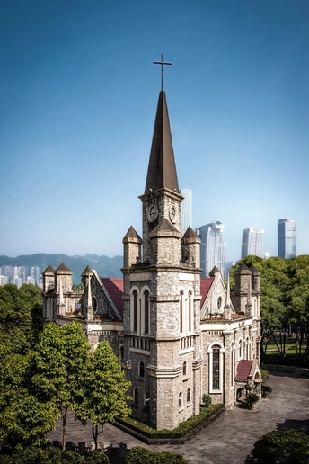 拍摄地点:重庆江北嘴·福音堂 一边是百年哥特式的浪漫,一边是8D山城的摩登,这就是重庆,把历史与未来,都写进了同一片蓝天里。