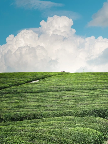 我站在这里,风穿过整片茶园,把数不清的茶垄抚成一片绿色的、有呼吸的海。 镜头对着的,是线条——一行行茶树被修剪得干净利落,顺着大地的弧度流淌下去,深绿浅绿交织,像大地最温柔的琴键。然后,是那两个闯入画面、又刚好成为画面心跳的小小人影。他们站在天与地的缝合线上,向着我举起手机拍照,好像在拍风景,又好像在拍我。这场景安静极了,却又充满故事——他们是我照片里风景的一部分,而我又成为他们眼里风景的一部分。 天空蓝得坦荡,云是这场静默演出真正的主角。它们一团团、一朵朵,饱满、蓬松、缓慢地游移,像是宫崎骏画纸上不小心飘出来的,带着某种不真实的善意。光线从云隙里漏下来,洒落在茶岭上,仿佛天上有一双眼睛也正在沉迷眼前这风景。 我按下快门,收藏这一刻。收藏这份无需解读的宁静,收藏这片绿野与晴空之间,人与天空一次小小的、美好的对望。